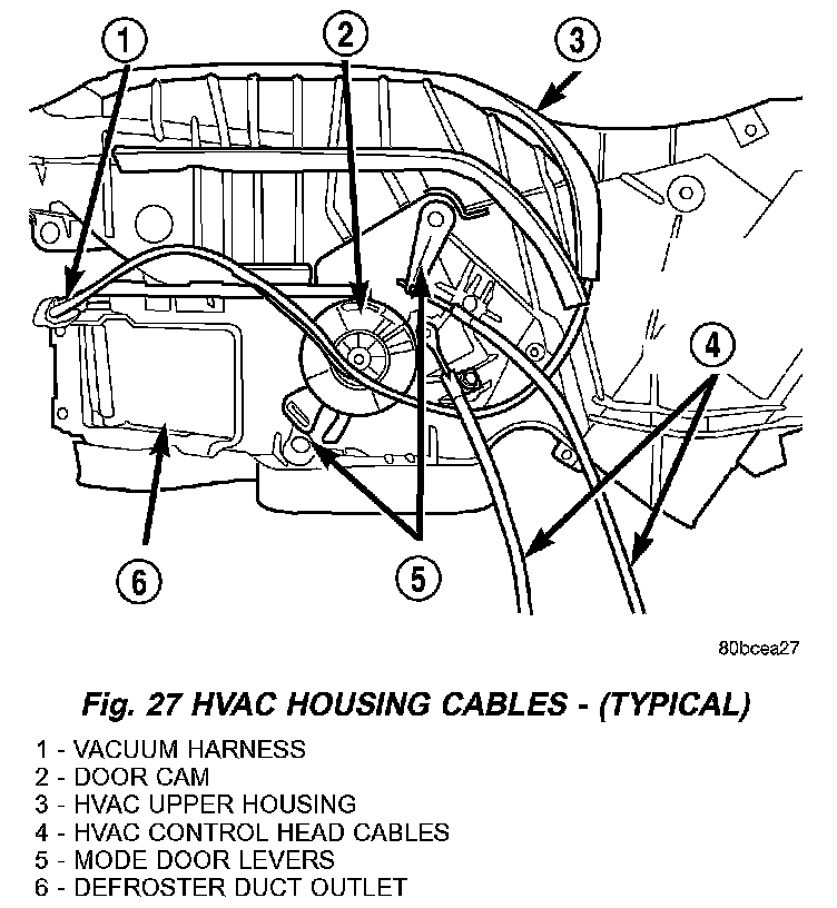 8. Remove the temperature control cable through the instrument panel heater-A/C control opening.