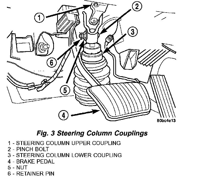 2. Inside the passenger compartment, remove the steering column coupling retainer pin, back off the pinch bolt nut, and remove the steering column coupling pinch bolt (the pinch bolt nut is caged to the coupling and is not removable). Separate the upper and lower steering column couplings.