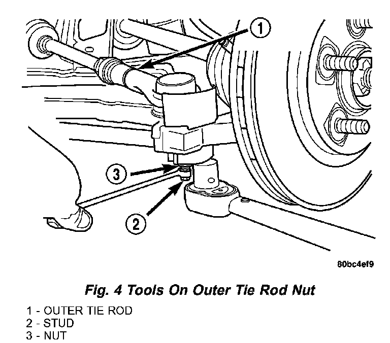 5. Remove nuts attaching both outer tie rods to the steering knuckles. Remove each nut by holding the tie rod stud stationary while loosening and removing the nut with a wrench.