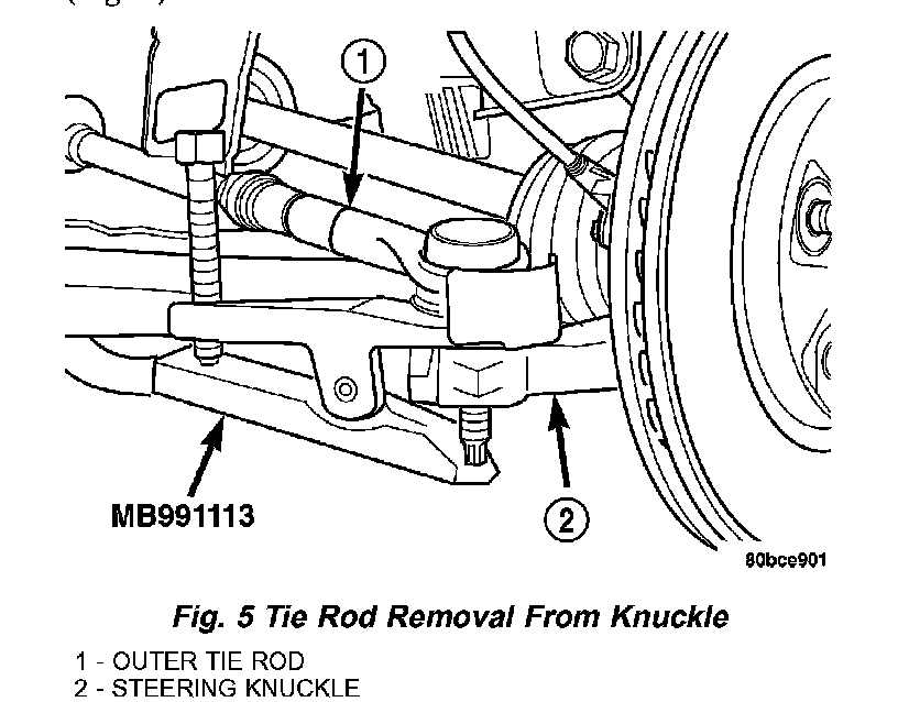 6. Remove the outer tie rod from the steering knuckles using Remover, Special Tool MB99 1113.