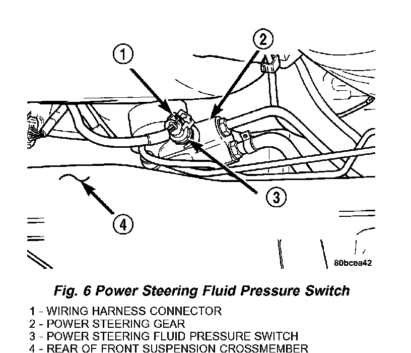 22. Reconnect the wiring harness connector from the power steering fluid pressure switch. Be sure the locking tab on the wiring harness connector is securely latched.