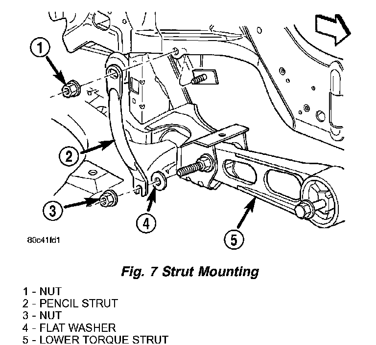 14. Remove the pencil strut from the right front corner of the crossmember and body of the vehicle. Remove the washer behind the strut from the torque strut bolt.