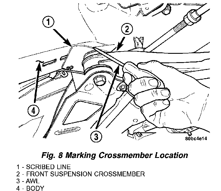 NOTE: Before removing the front suspension crossmember from the vehicle, the location of the crossmember must be scribed on the body of the vehicle. Do this so that the crossmember can be relocated upon reinstallation against the body of vehicle in the same location as before removal. If the front suspension crossmember is not reinstalled in exactly the same location as before removal, the preset front wheel alignment settings (caster and camber) will be lost.