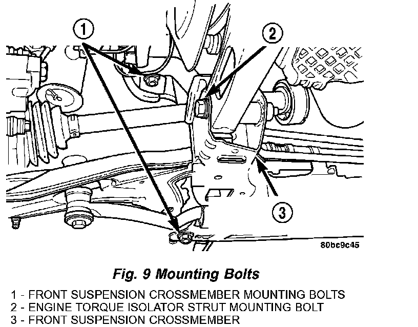 NOTE: When reinstalling the front suspension crossmember back in the vehicle, it is very important that the crossmember be attached to the body in exactly the same spot as when it was removed. Otherwise, the vehicle's wheel alignment settings (caster and camber) will be lost.