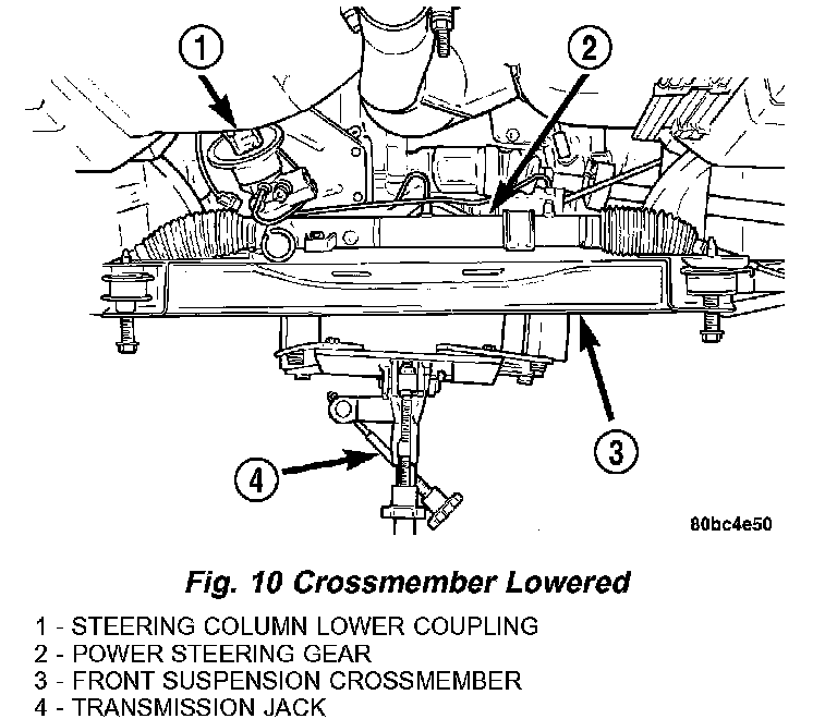 17. Position a transmission jack under the center of the front suspension crossmember and raise it to support the bottom of the crossmember.