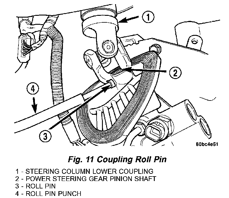 21. Remove the roll pin securing the steering column lower coupling to the power steering gear pinion shaft using a roll pin punch. Push the steering column lower coupling up and off of the power steering gear pinion shaft.