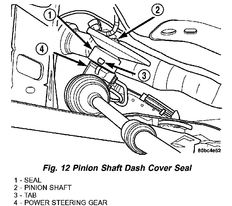 2. Install the pinion shaft dash cover seal over the power steering pinion shaft and onto the power steering gear housing. Align the holes on each side of the seal with the tabs cast into the power steering gear housing.