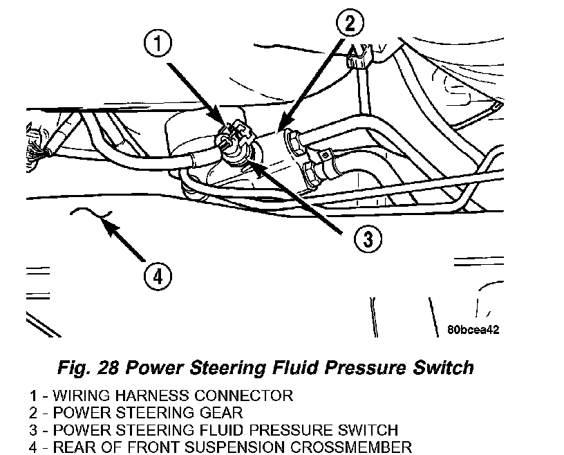 10. Reconnect the wiring harness connector to the power steering fluid pressure switch. Be sure the locking tab on the wiring harness connector is securely latched.