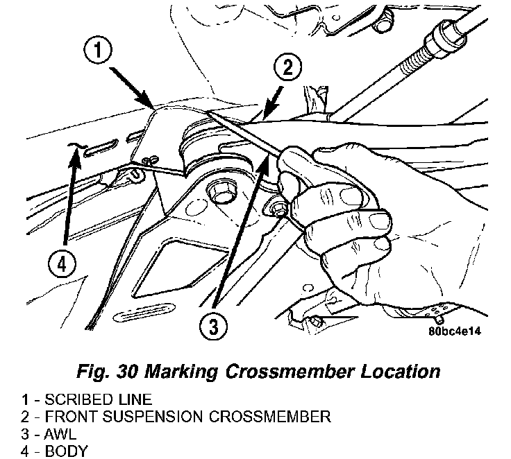 8. Using an awl, scribe a line marking the location of where the front suspension crossmember is mounted against the body of the vehicle.