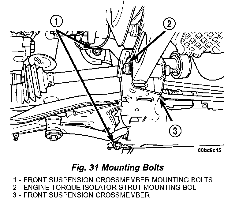 NOTE: When reinstalling the front suspension crossmember back in the vehicle, it is very important that the crossmember be attached to the body in exactly the same spot as when it was removed. Otherwise, the vehicle's wheel alignment settings (caster and camber) will be lost.