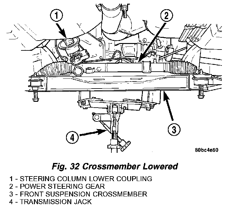12. Lower the front suspension crossmember using the transmission jack enough to allow sufficient access to the steering column lower coupling. When lowering front suspension crossmember, do not let crossmember hang from lower control arms or power steering hoses. The weight should be supported by the transmission jack.