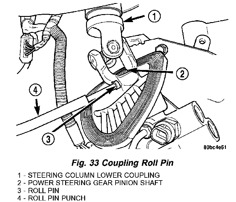 13. Remove the roll pin securing the steering column lower coupling to the power steering gear pinion shaft using a roll pin punch. Push the steering column lower coupling up and off of the power steering gear pinion shaft.
