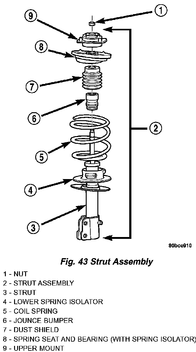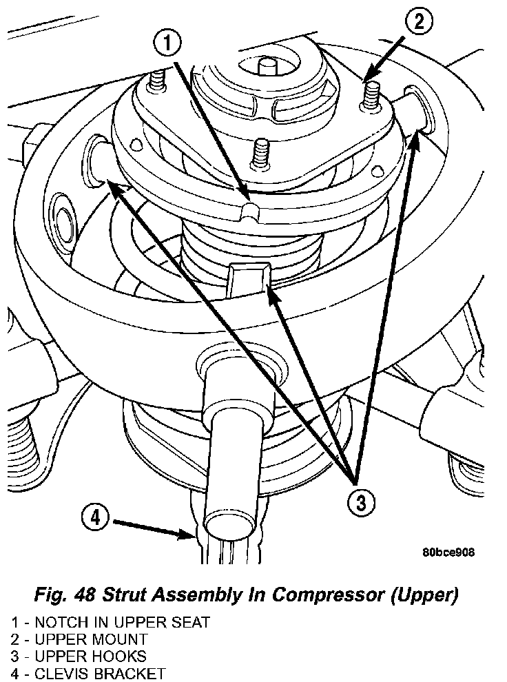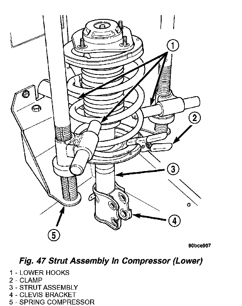 For the disassembly and assembly of the strut assembly, use strut spring compressor, Pentastar Service Equipment (PSE) tool W-7200, or the equivalent, to compress the coil spring. Follow the manufacturer's instructions closely.