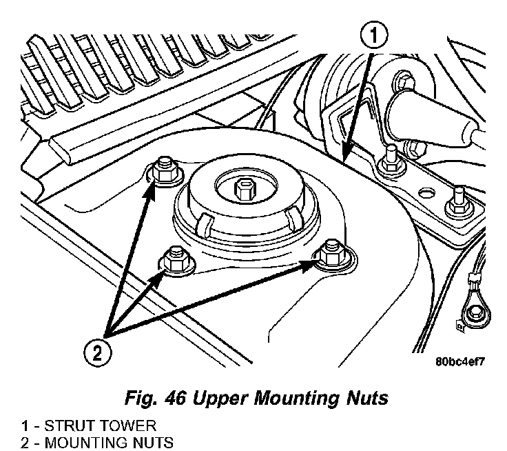 1. Install the strut assembly into the strut tower, aligning the three studs on the strut upper mount with the holes in strut tower. Install the three mounting nuts on the studs. Tighten the three nuts to a torque of 34 Nm (300 inch lbs.).