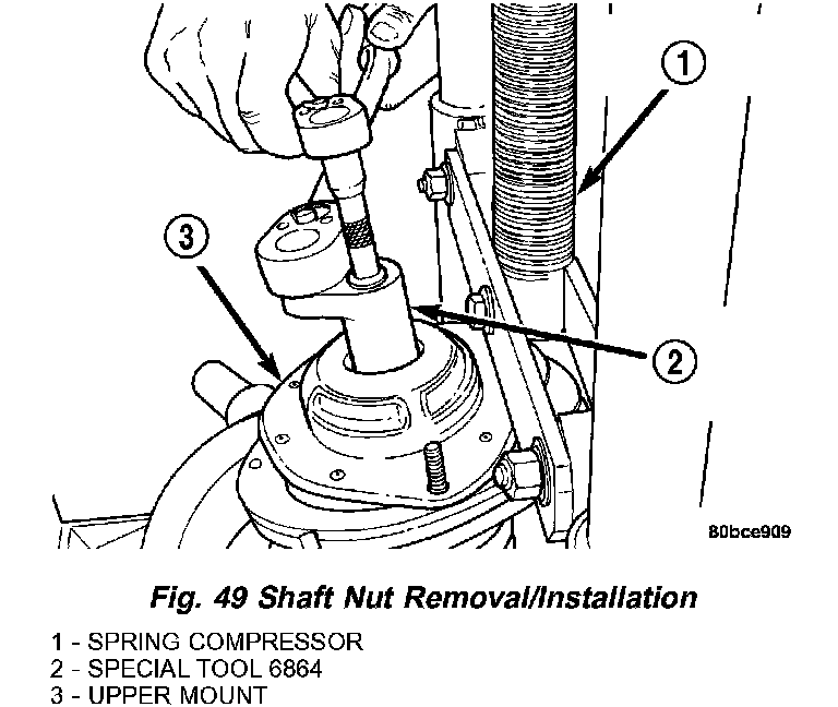 WARNING: DO NOT REMOVE THE STRUT SHAFT NUT BEFORE THE COIL SPRING IS COMPRESSED. THE COIL SPRING IS HELD UNDER PRESSURE AND MUST BE COMPRESSED, REMOVING SPRING TENSION FROM THE UPPER MOUNT AND PIVOT BEARING, BEFORE THE SHAFT NUT IS REMOVED.