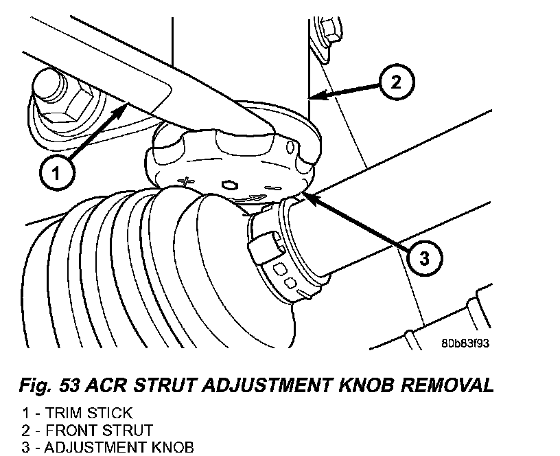 Vehicles equipped with the optional ACR performance package have adjustable struts. A single adjustment knob is located on the bottom of each front and rear strut. The one knob adjusts both bump and rebound characteristics. It adjusts the strut up to 24 different positions (notches or detents), six per revolution. Turn the knob clockwise to increase firmness and counterclockwise to decrease firmness.