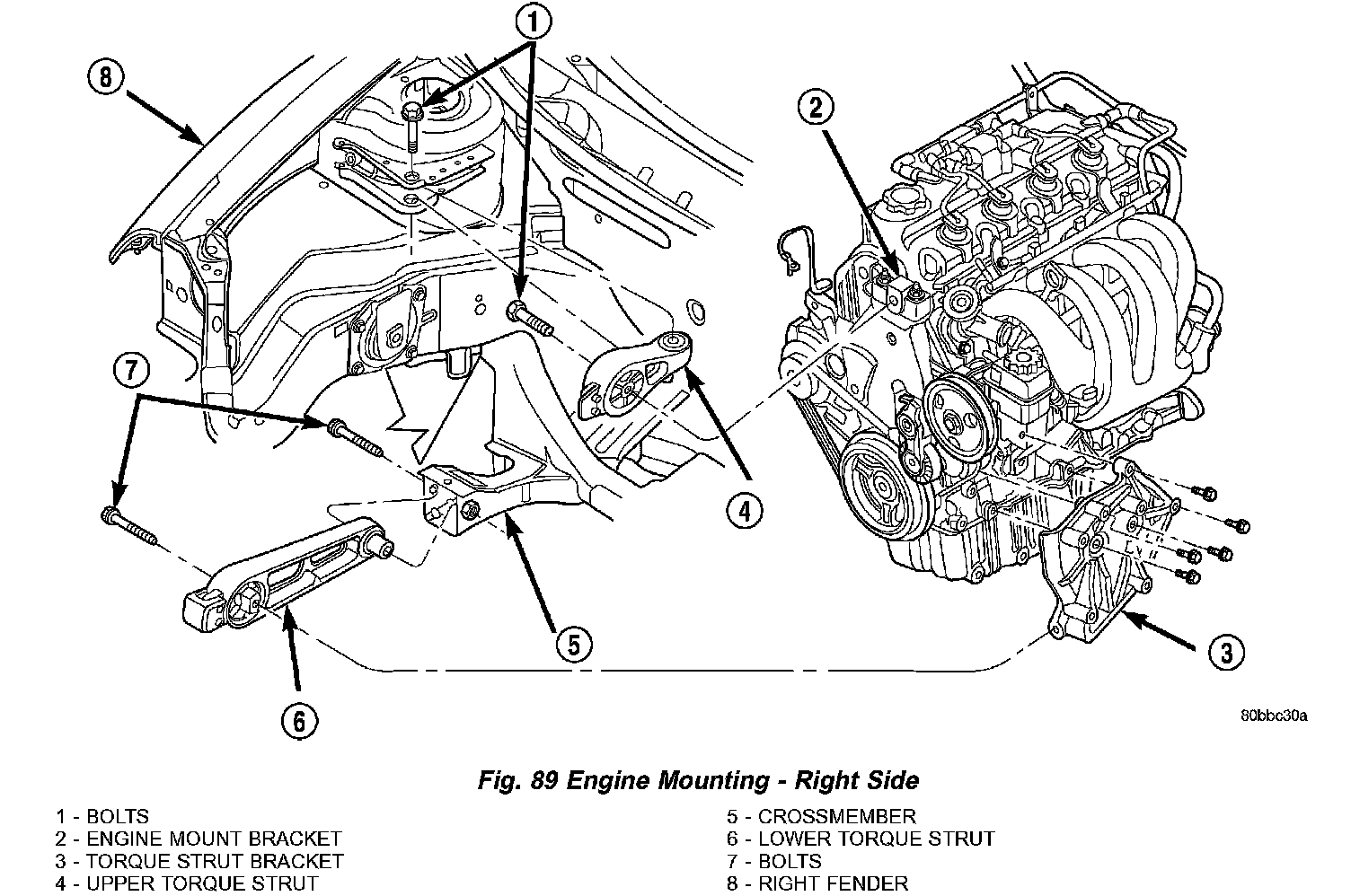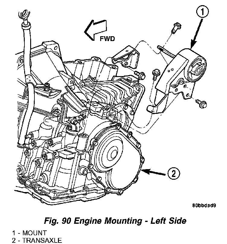The engine mounting system (Fig. 89) and (Fig. 90) consist of a four-point system utilizing two load-carrying mounts and two torque struts. The load-carrying mounts are located on each frame rail. The right mount is a hydro-elastic mount and left mount is a conventional elastomeric isolator. The two torque controlling struts are attached at the front of the engine, straddling the right side load-carrying mount. The upper torque strut connects to the suspension strut tower and the lower torque strut connects to the suspension crossmember.