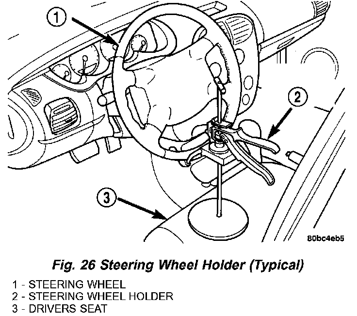 1. Place the steering wheel in the STRAIGHT-AHEAD position. Using a steering wheel holder, lock the steering wheel in place to keep it from rotating (Fig. 26). This keeps the clockspring in the proper orientation.