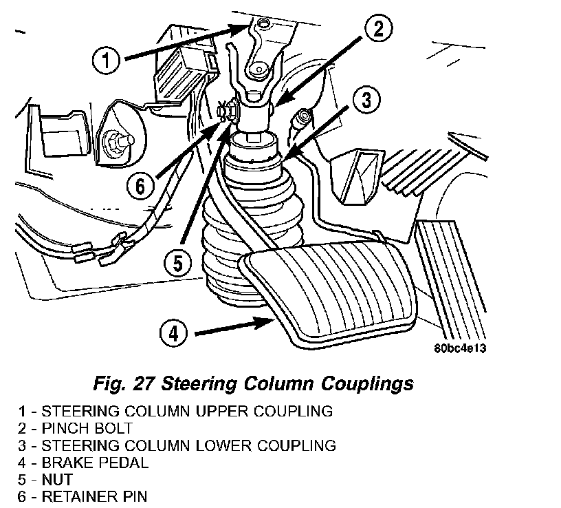 2. Inside the passenger compartment, remove the steering column coupling retainer pin, back off the pinch bolt nut, and remove the steering column coupling pinch bolt (Fig. 27) (the pinch bolt nut is caged to the coupling and is not removable). Separate the upper and lower steering column couplings.