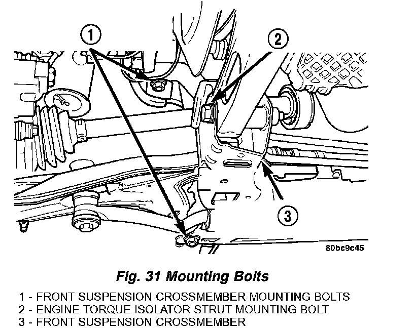11. Loosen the two rear bolts (one right and one left) attaching the front suspension crossmember and lower control arms to the body of the vehicle until they release from the threaded tapping plates in the body of the vehicle. Do not completely remove the rear bolts because they are designed to disengage from the body threads yet stay within the lower control arm rear isolator bushing. This allows the lower control arm to stay in place on the crossmember. The right side bolt can be viewed in the mounting bolt figure (Fig. 31). The left side bolt is located in the same location on the other side of the vehicle.
