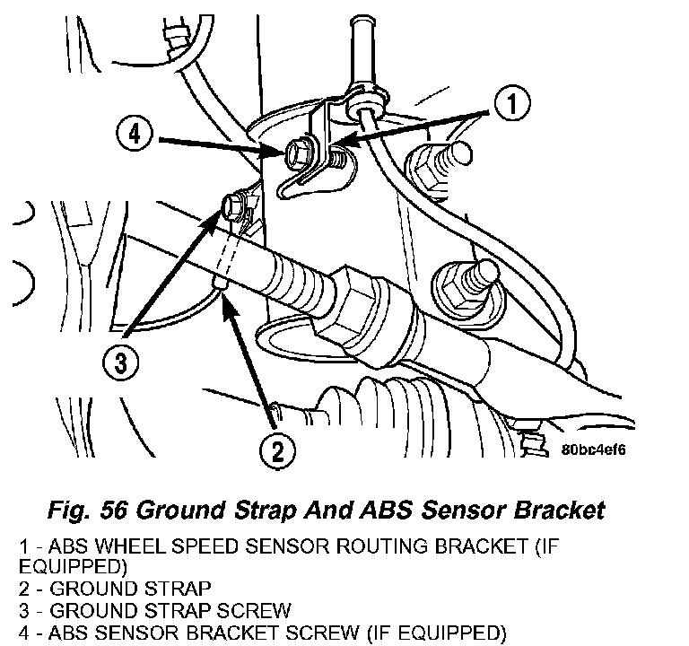 4. If the vehicle is equipped with Antilock brakes (ABS), attach the ABS wheel speed sensor to the rear of the strut (rearward ear) using its mounting screw (Fig. 56). Tighten the mounting screw to a torque of 13 Nm (120 inch lbs.).