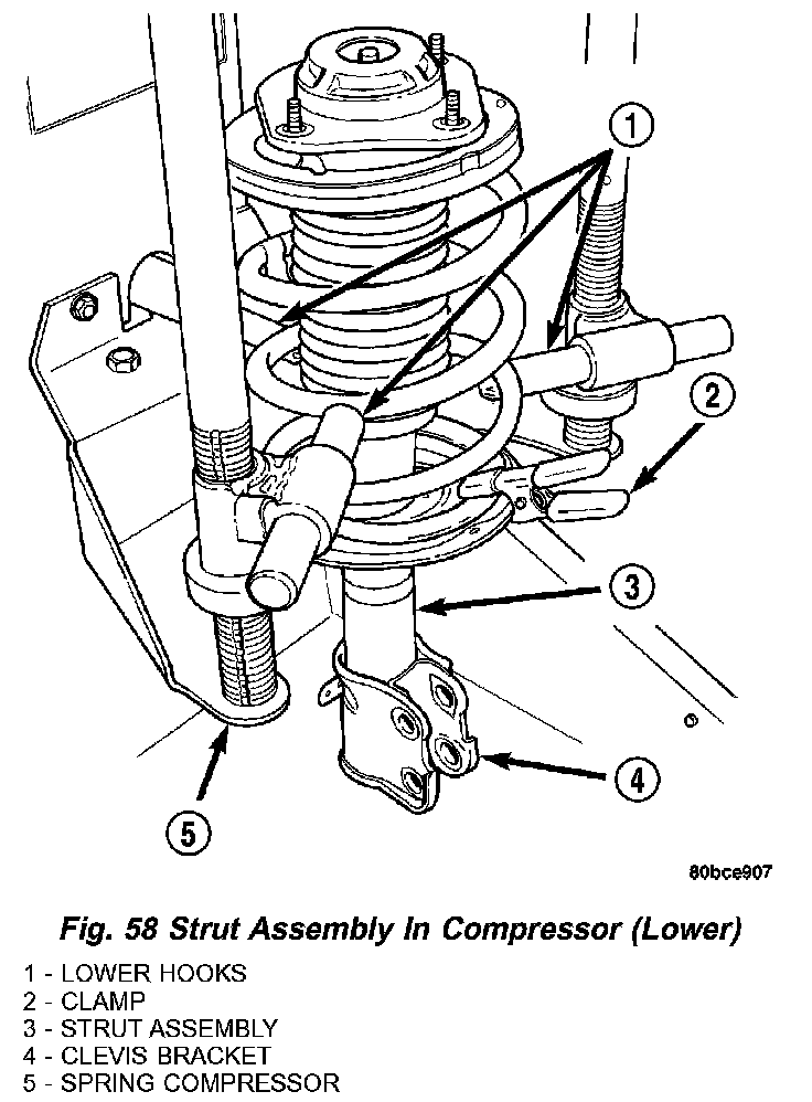 For the disassembly and assembly of the strut assembly, use strut spring compressor, Pentastar Service Equipment (PSE) tool W-7200, or the equivalent, to compress the coil spring. Follow the manufacturer's instructions closely.