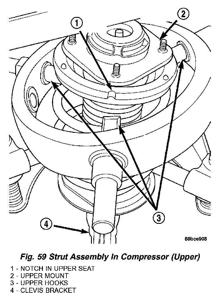 8. Install the upper spring seat and bearing on top of the coil spring. Position the notch formed into the edge of the upper seat straight out away from the compressor (Fig. 59).