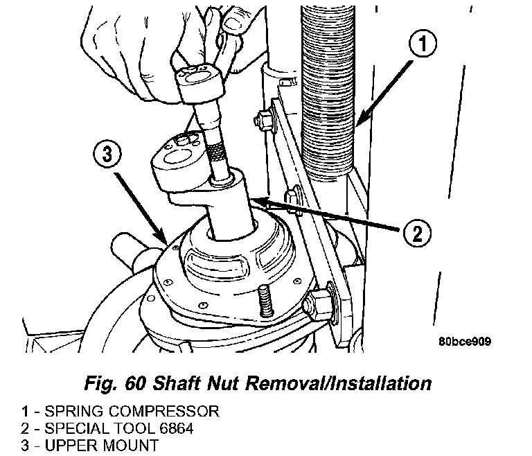4. Once the spring is sufficiently compressed, install Strut Nut Socket, Special Tool 6864, on the strut shaft retaining nut (Fig. 60). Next, install a socket on the hex on the end of the strut shaft. While holding the strut shaft from turning, remove the nut from the strut shaft.