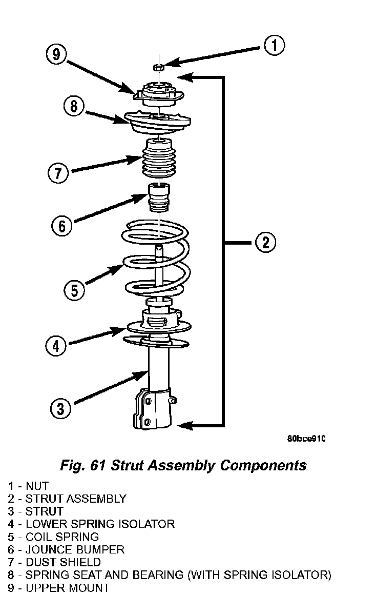6. Remove the upper spring seat and bearing, along with the upper spring isolator as an assembly from the top of the coil spring by pulling them straight up (Fig. 61). The upper spring isolator can be separated from the spring seat and bearing once removed from vehicle.
