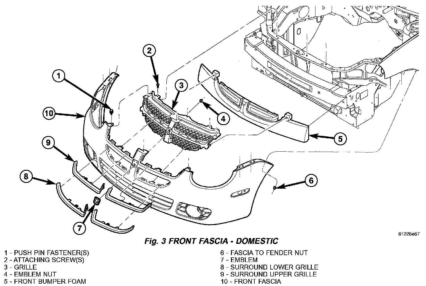 7. SRT-4 vehicle remove the fascia to crossmember upper blockers from the fascia (Fig. 5).