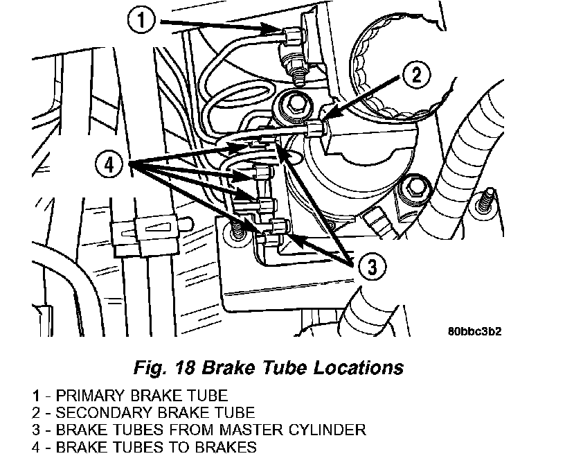 9. Tag the brake tubes coming from the master cylinder as primary and secondary (Fig. 18). This is done to avoid mix-up once the tubes are removed from the vehicle.