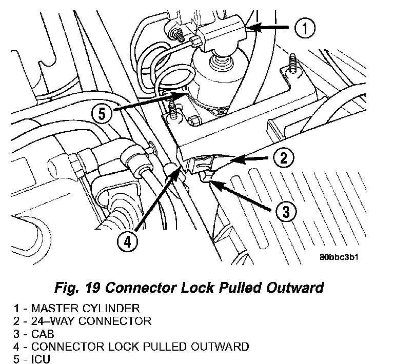 8. Disconnect the 24-way connector from the Controller Antilock Brake (CAB) mounted on the Integrated Control Unit (ICU) and move it out of the way. The connector is disconnected by pulling outward on the connector lock (Fig. 19). This will unlock and raise the 24-way connector out of the socket on the CAB.