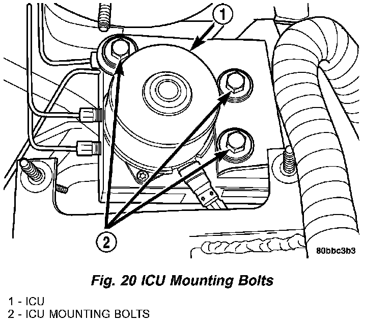 2. Install the 3 bolts attaching the ICU to the mounting bracket (Fig. 20). Tighten the 3 mounting bolts to a torque of 11 Nm (97 inch lbs.).