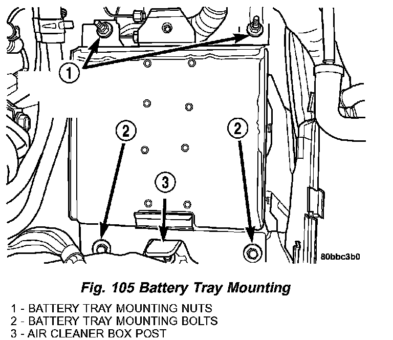 5. Remove the 2 bolts, then the 2 nuts mounting the battery tray to its bracket (Fig. 105). Remove the battery tray.