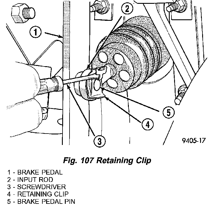 10. Locate the brake pedal-to-power brake booster input rod attachment under the instrument panel. Position a small screwdriver (Fig. 107) under the center tang of the retaining clip. Rotate the screwdriver enough to allow the retaining clip tang to pass over the end of the brake pedal pin. Remove the clip.