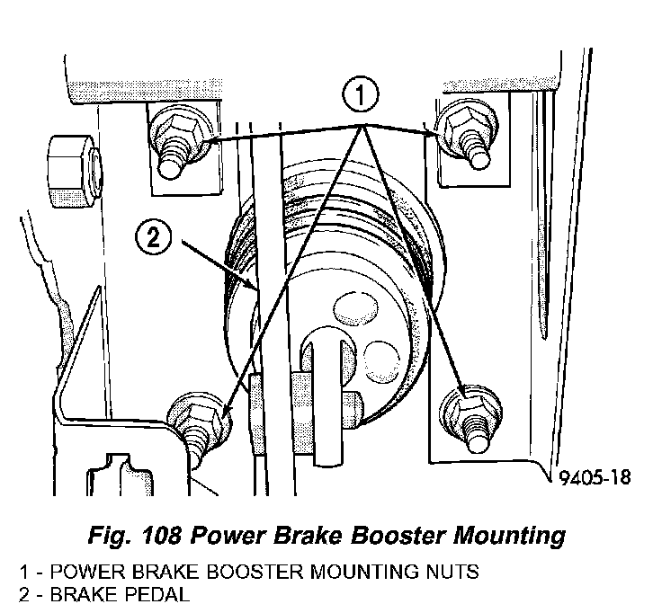 11. Remove the four nuts attaching the power brake booster to the instrument panel (Fig. 108). The nuts are accessible from under the instrument panel in the area of the brake pedal bracket.