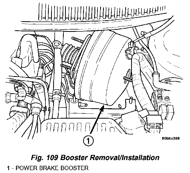 12. Slide the power brake booster forward until mounting studs clear the instrument panel. Turn the booster sideways (Fig. 109), then remove it from the vehicle.