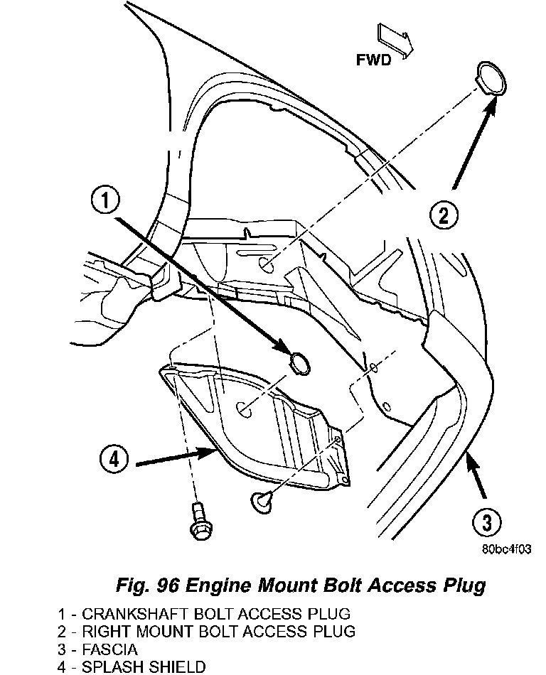 10. Remove engine mount through bolt access plug (Fig. 96)