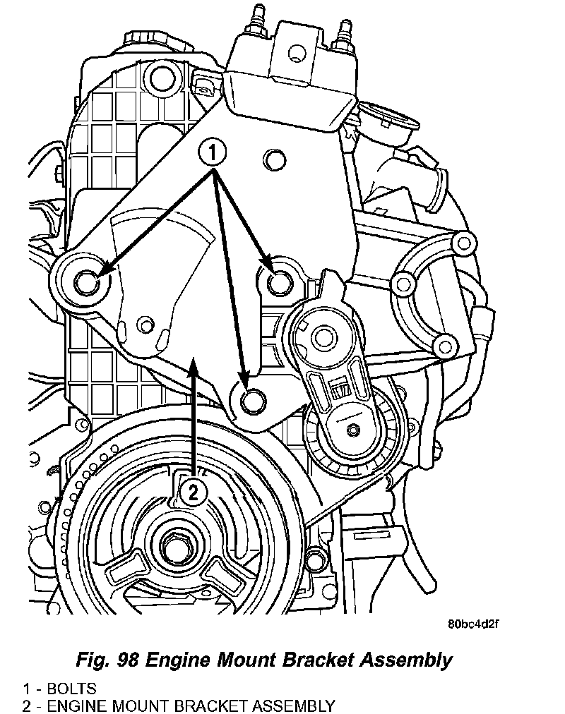 1. Position engine mount bracket to its mounting location. Hand start the upper two bolts of the engine mount bracket (Fig. 98).