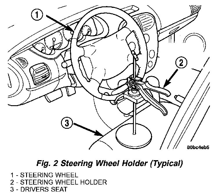 1. Place the steering wheel in the STRAIGHT AHEAD position. Using a steering wheel holder, lock the steering wheel in place to keep it from rotating (Fig. 2). This keeps the clockspring in the proper orientation.
