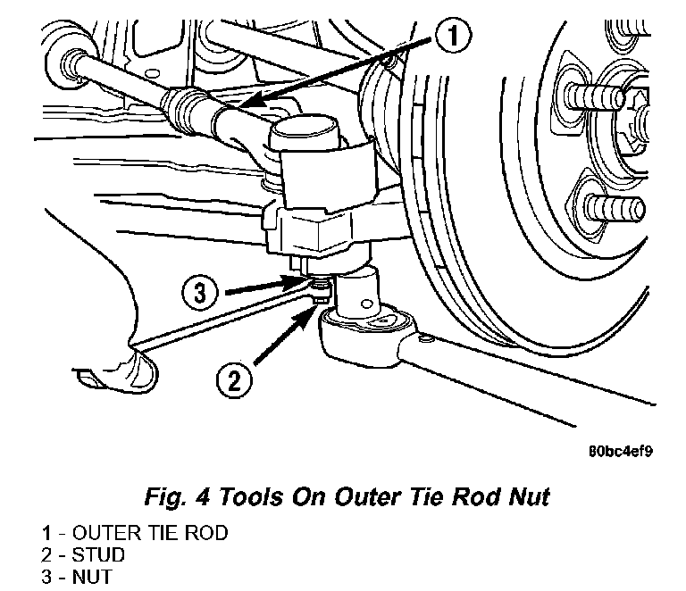 6. Remove the outer tie rod from the steering knuckles using Remover, Special Tool MB991113 (Fig. 5).