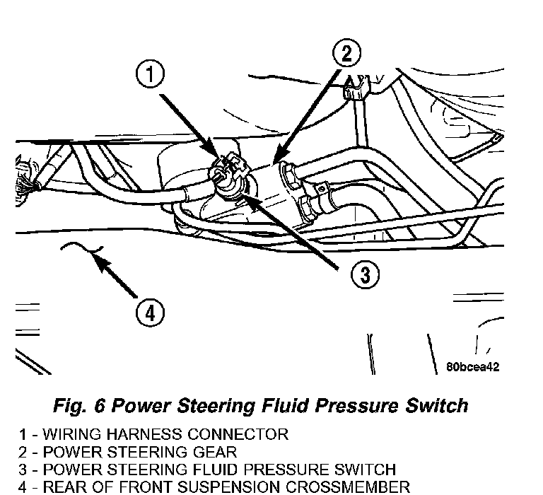 8. Release the locking tab on the wiring harness connector for the power steering fluid pressure switch before connector removal. Remove the wiring harness connector from the power steering fluid pressure switch (Fig. 6).