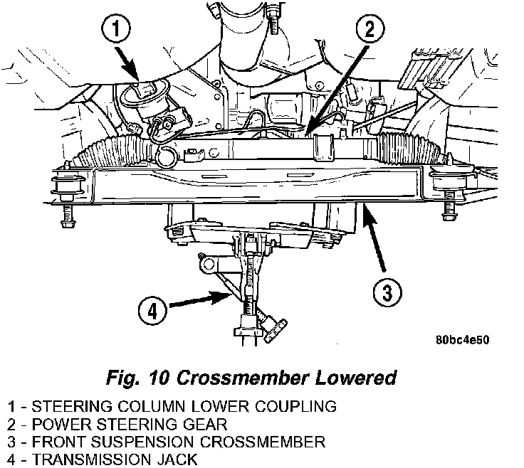 20. Lower the front suspension crossmember using the transmission jack enough to allow the power steering gear to be removed from the rear of the crossmember (Fig. 10). When lowering front suspension crossmember, do not let crossmember hang from lower control arms. The weight should be supported by the transmission jack.
