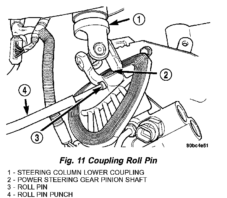 21. Remove the roll pin securing the steering column lower coupling to the power steering gear pinion shaft using a roll pin punch (Fig. 11). Push the steering column lower coupling up and off of the power steering gear pinion shaft.