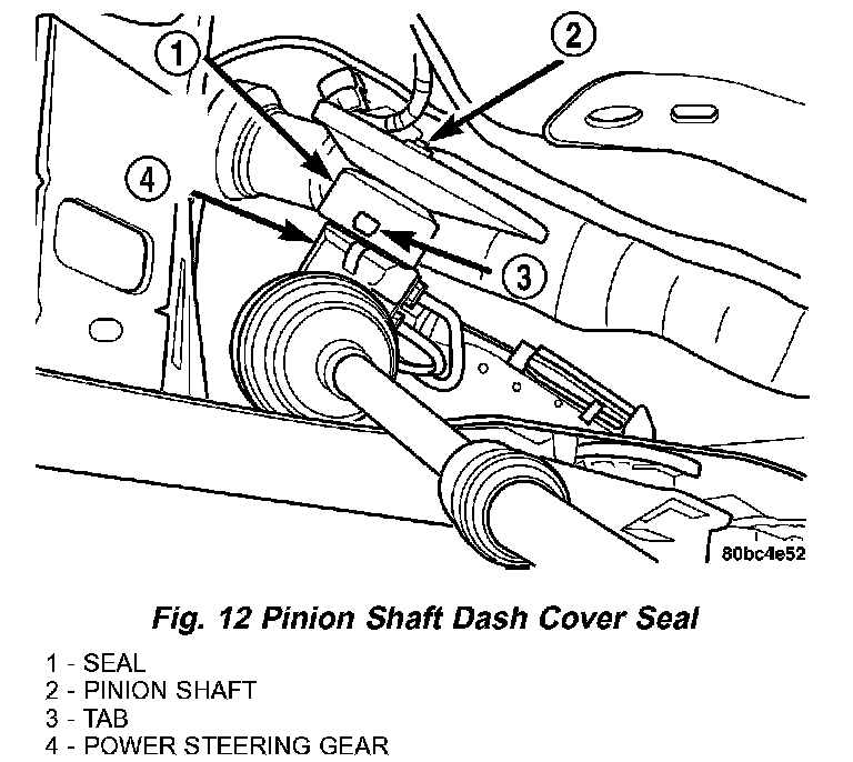 2. Install the pinion shaft dash cover seal over the power steering pinion shaft and onto the power steering gear housing. Align the holes on each side of the seal with the tabs cast into the power steering gear housing (Fig. 12).
