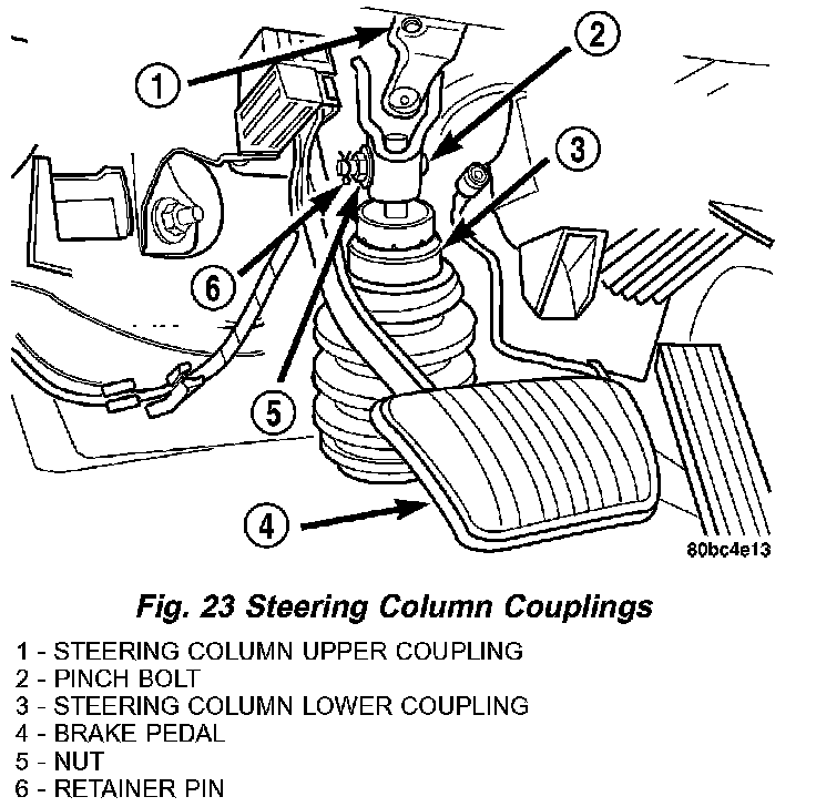 2. Inside the passenger compartment, remove the steering column coupling retainer pin, back off the pinch bolt nut, and remove the steering column coupling pinch bolt (Fig. 23) (the pinch bolt nut is caged to the coupling and is not removable). Separate the upper and lower steering column couplings.