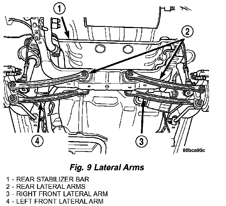 The lateral arms control the lateral movement of the rear suspension, specifically the knuckle (Fig. 1). There are two lateral arms per side of the rear suspension. One arm is attached to the front end of the knuckle and the other is attached to the rear of the knuckle. The other end of each lateral arm attaches to the rear crossmember.