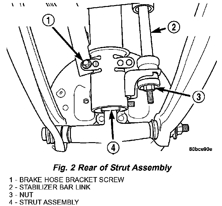 11. If the vehicle is equipped with rear drum brakes, install the screw securing the brake hose bracket to the rear of the strut assembly (Fig. 2). Tighten the screw to a torque of 31 Nm (275 inch lbs.).