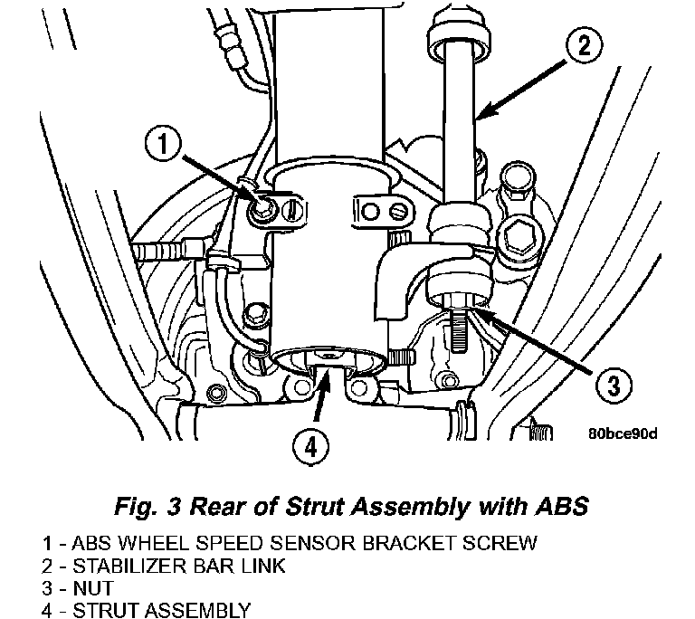 12. If the vehicle is equipped with the Antilock Brake System (ABS), install the screw securing the ABS wheel speed sensor bracket to the rear of the strut assembly (Fig. 3). Tighten the mounting screw to a torque of 13 Nm (120 inch lbs.).