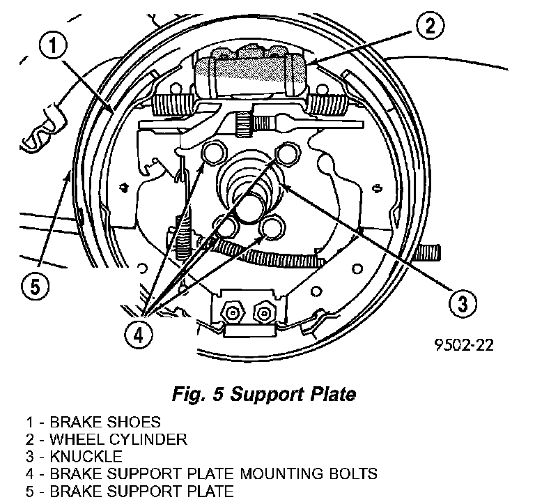 9. If vehicle is equipped with rear drum brakes, remove the four bolts attaching the rear brake support plate to the knuckle (Fig. 5). Next, remove the brake support plate, brake shoes and wheel cylinder as an assembly from the rear knuckle, then hang it out of the way using a wire hanger or cord. Do not overextend the brake hose when being hung. It is not necessary to remove the brake hose from the wheel cylinder when removing the support plate.
